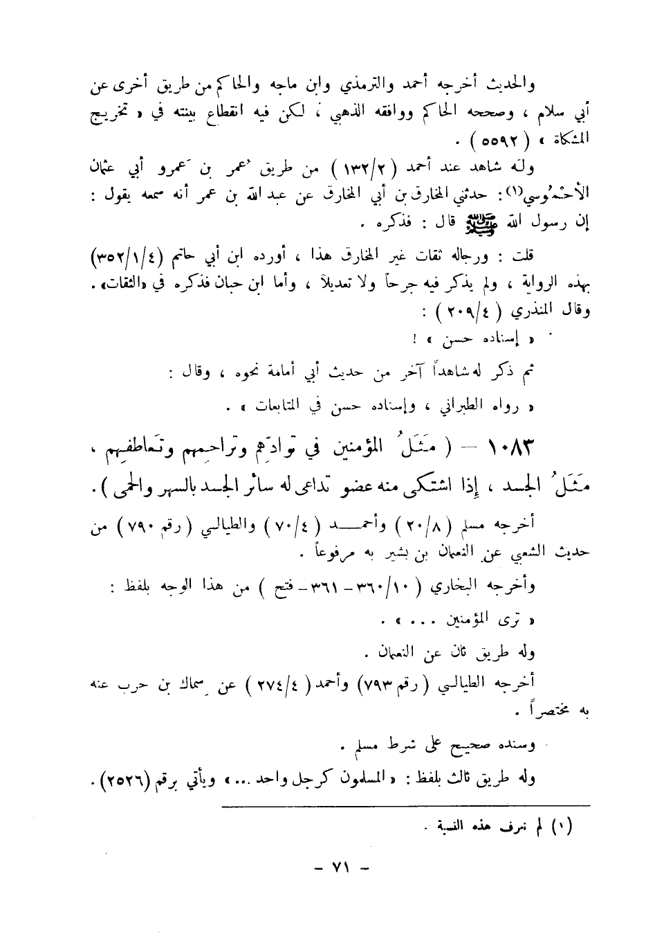1083 - " مثل المؤمنين في توادهم وتراحمهم وتعاطفهم مثل الجسد، إذا اشتكى منه عضو