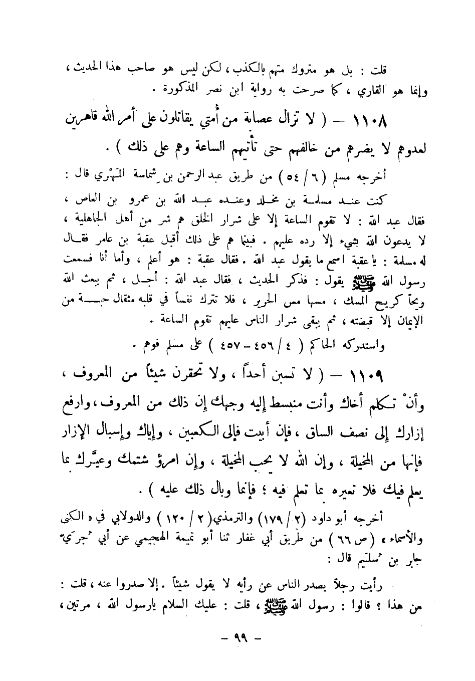 1108 - " لا تزال عصابة من أمتي يقاتلون على أمر الله قاهرين لعدوهم لا يضرهم من