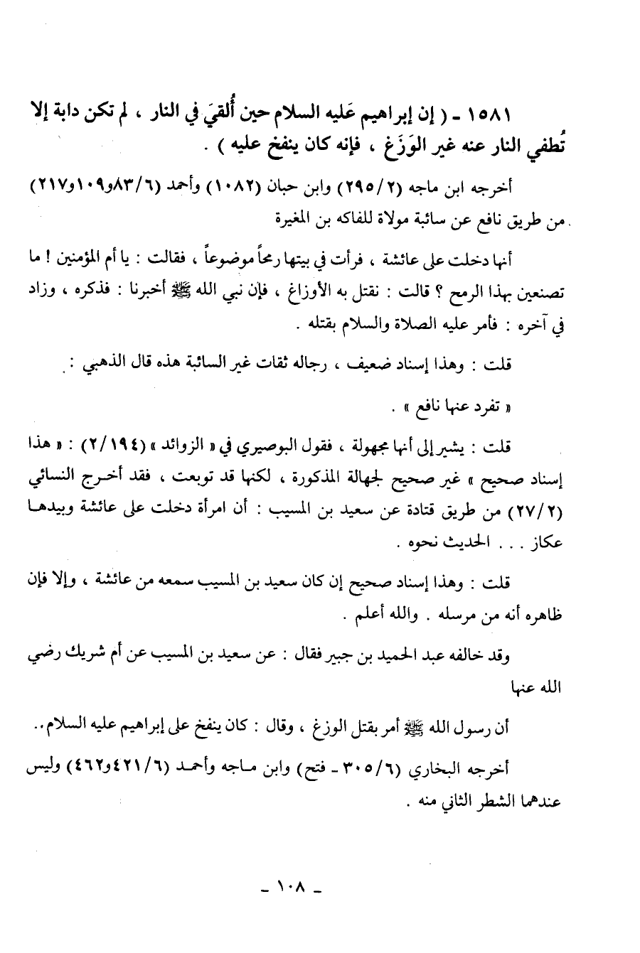 1581 - " إن إبراهيم عليه السلام حين ألقي في النار، لم تكن دابة إلا تطفي النار عنه