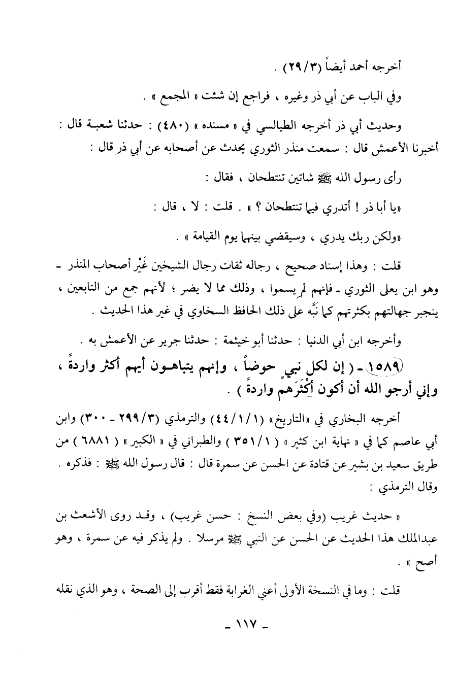 1589 - " إن لكل نبي حوضا، وإنهم يتباهون أيهم أكثر واردة، وإني أرجو الله أن أكون