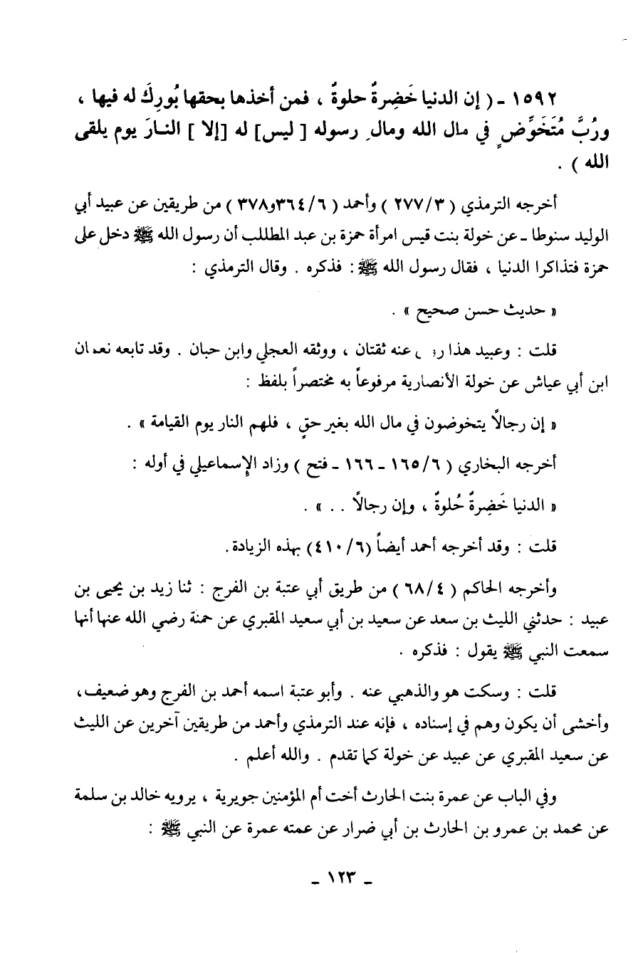 1592 - " إن الدنيا خضرة حلوة، فمن أخذها بحقها بورك له فيها، ورب متخوض في مال