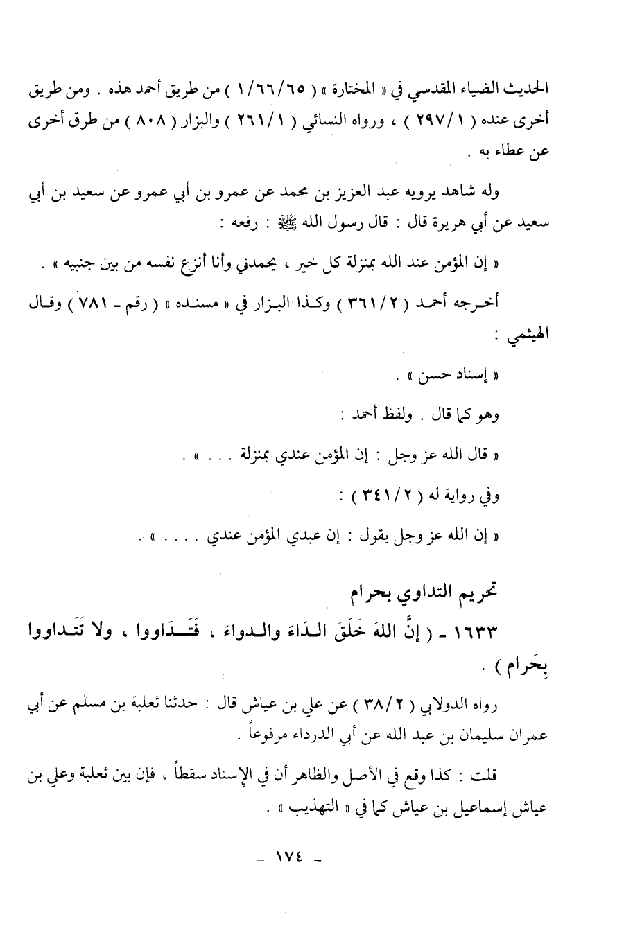 1633 - " إن الله خلق الداء والدواء، فتداووا، ولا تتداووا بحرام ".
