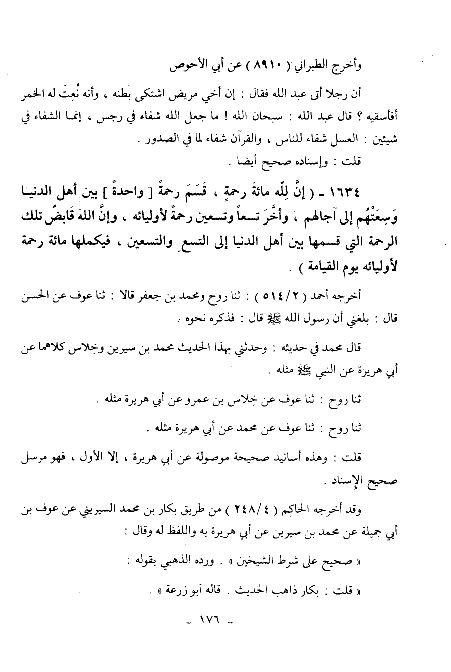 1634 - " إن لله مائة رحمة قسم رحمة (واحدة) بين أهل الدنيا وسعتهم إلى آجالهم وأخر