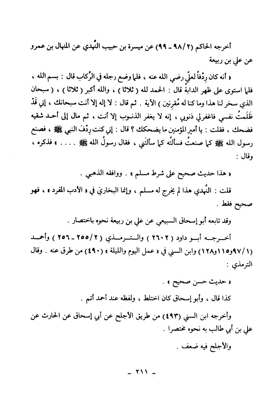 قال: بسم الله، فلما استوى على ظهر الدابة قال: الحمد لله (ثلاثا) والله