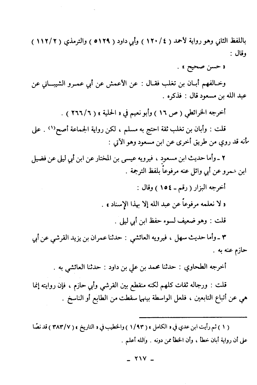 (¬1) ثم رأيت ابن عدي في " الكامل " (93 / 1) والخطيب في " التاريخ " (7 / 383) قد نصا على أن رواية أبان خطأ وأن الخطأ ممن دونه. والله أعلم. اهـ.
