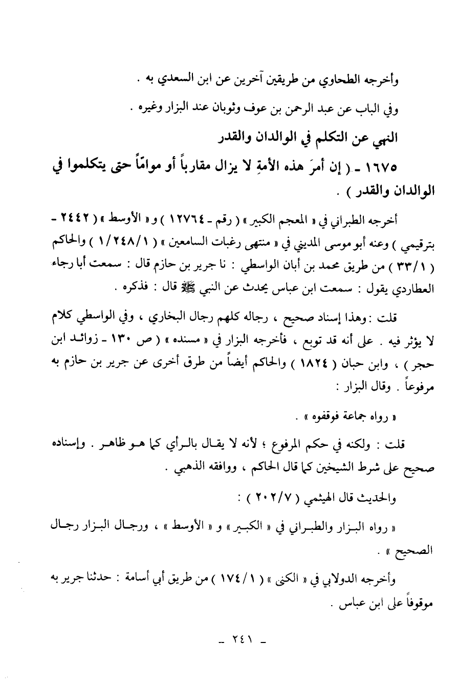 1675 - " إن أمر هذه الأمة لا يزال مقاربا أو مواما حتى يتكلموا في الوالدان والقدر ".