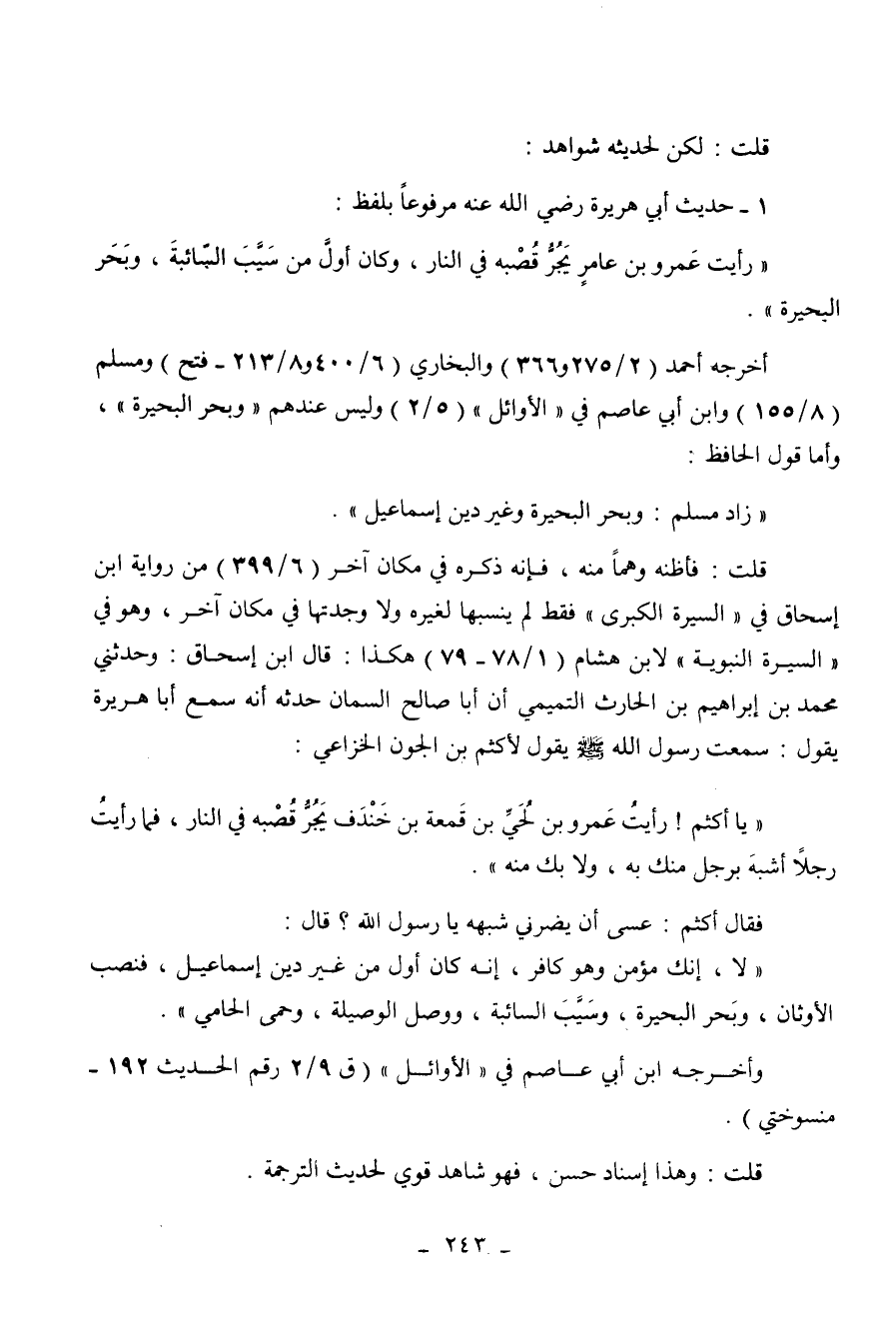 في النار وكان أول من سيب السائبة وبحر البحيرة " أخرجه أحمد (2 / 275 و 366