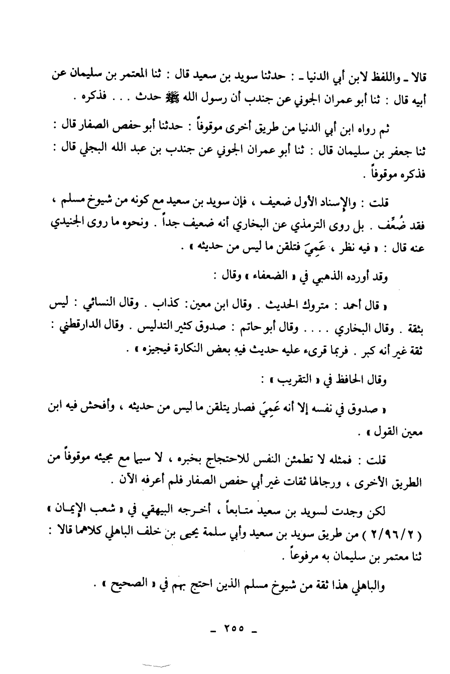 قالا - واللفظ لابن أبي الدنيا -: حدثنا سويد بن سعيد قال: حدثنا المعتمر بن