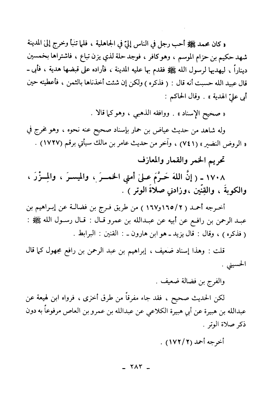 1708 - " إن الله حرم على أمتي الخمر والميسر والمزر والكوبة والقنين وزادني صلاة