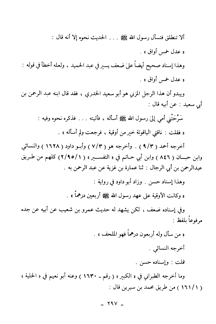 إلا أنه قال: " عدل خمس أواق ". وهذا إسناد صحيح أيضا على ضعف يسير في عبد