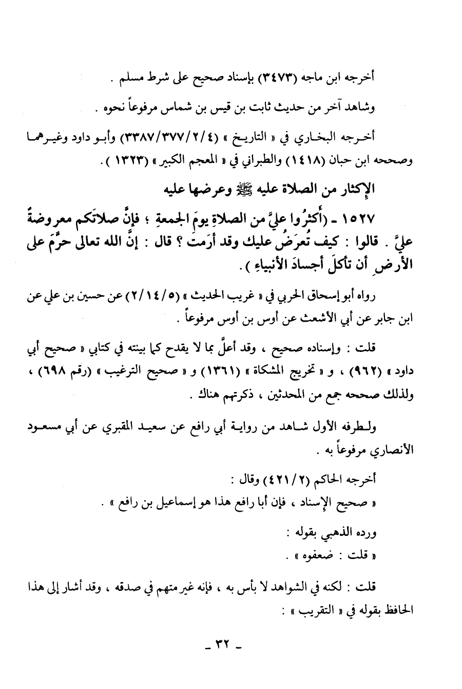 1527 - " أكثروا علي من الصلاة يوم الجمعة، فإن صلاتكم معروضة علي. قالو: كيف تعرض