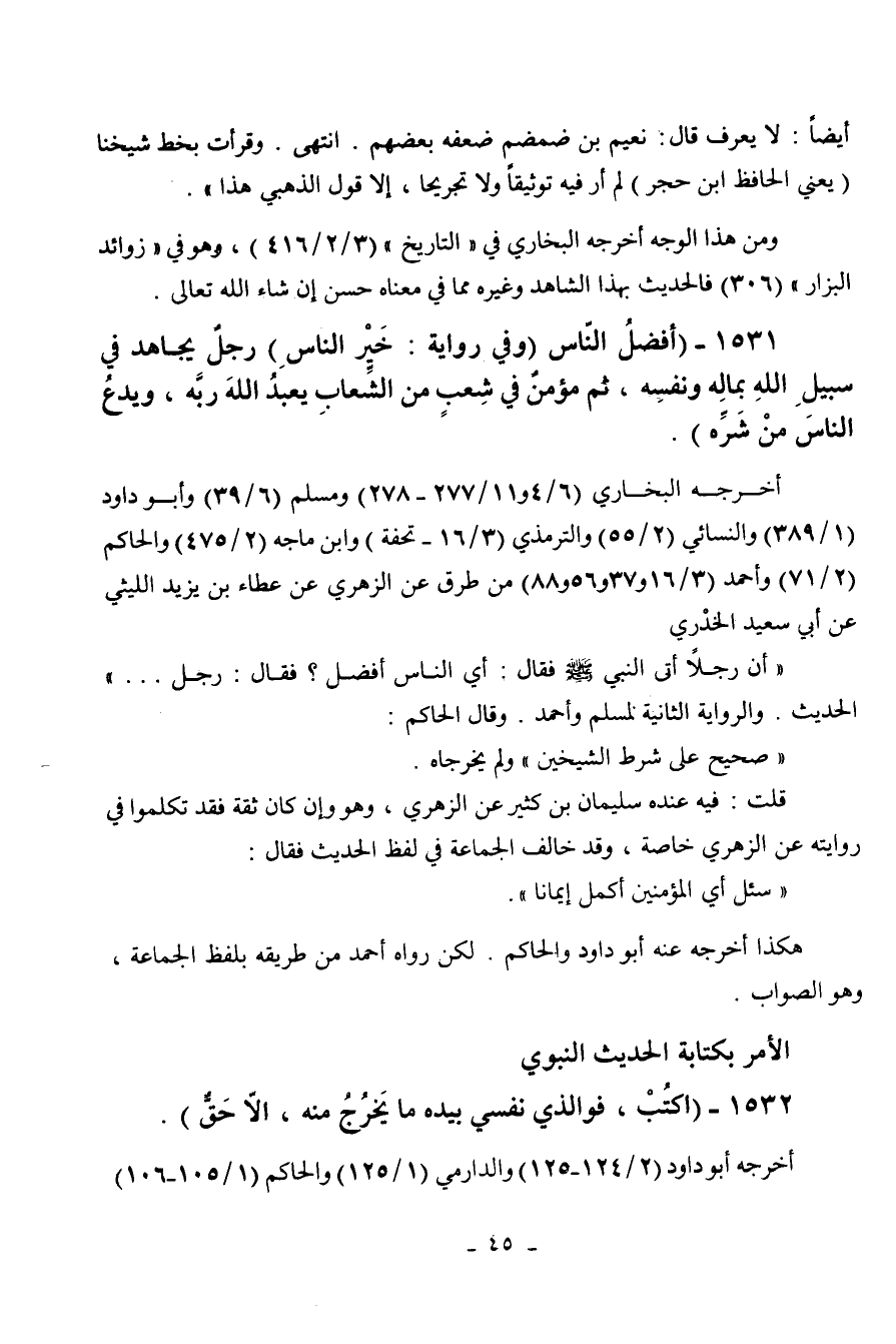 1531 - " أفضل الناس (وفي رواية: خير الناس) رجل يجاهد في سبيل الله بماله ونفسه