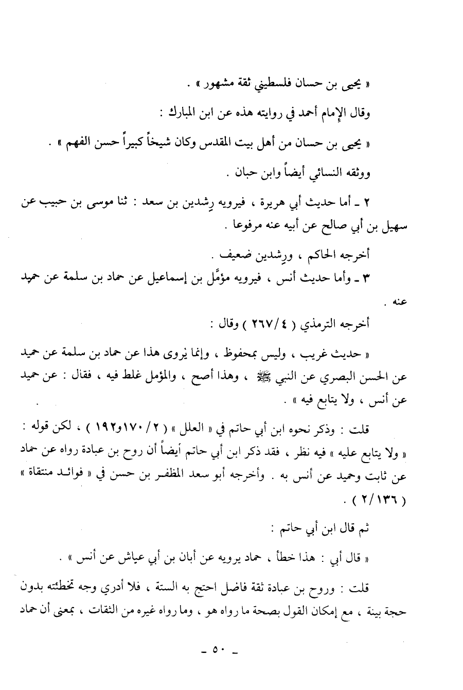 " يحيى بن حسان فلسطيني ثقة مشهور ". وقال الإمام أحمد في