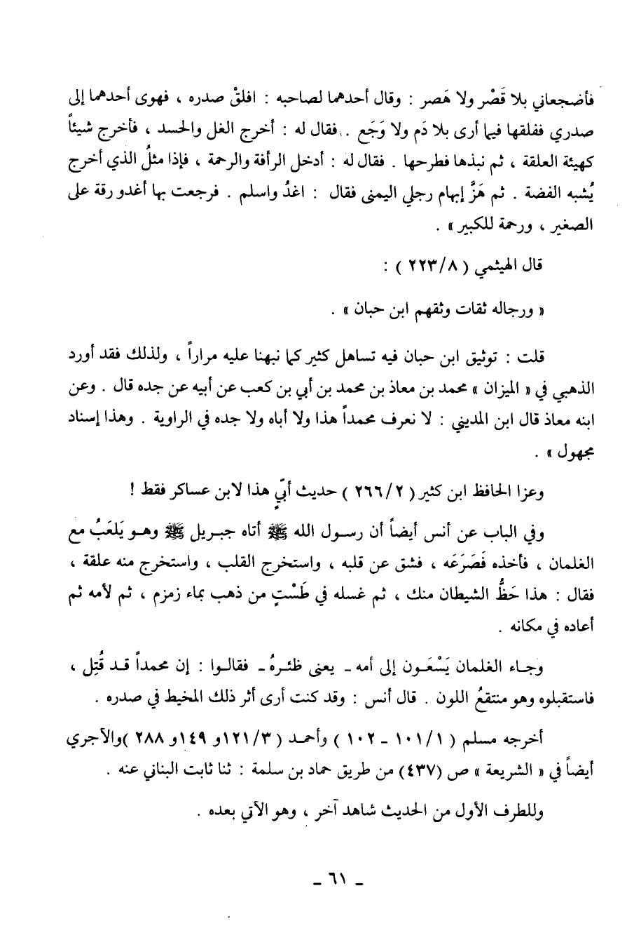 ففلقها فيما أرى بلا دم ولا وجع. فقال له: أخرج الغل والحسد، فأخرجا شيئا