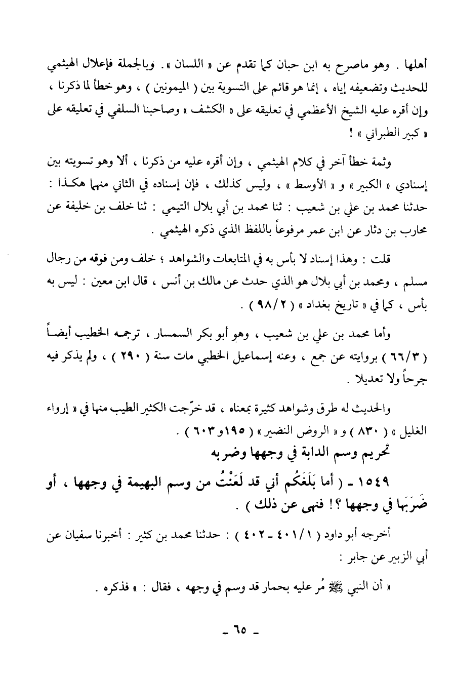 1549 - " أما بلغكم أني قد لعنت من وسم البهيمة في وجهها، أو ضربها في وجهها؟! فنهى