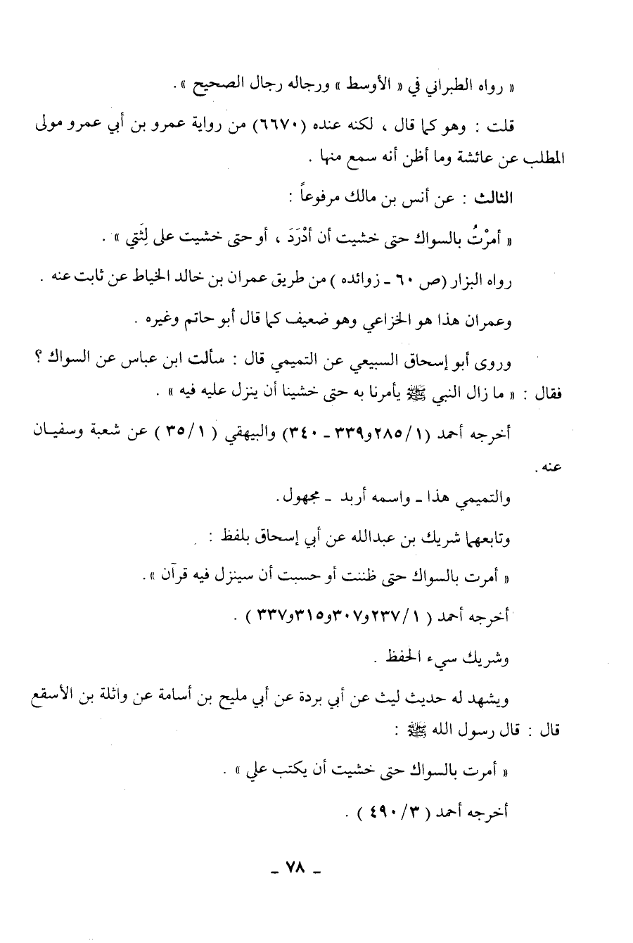 إسحاق بلفظ: " أمرت بالسواك حتى ظننت أو حسبت أن سينزل فيه القرآن ". أخرجه