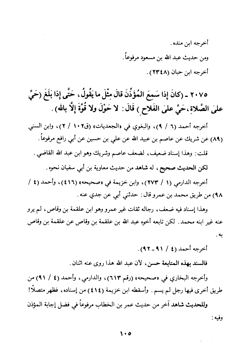 2075 - " كان إذا سمع المؤذن قال مثل ما يقول، حتى إذا بلغ (حي على الصلاة، حي على