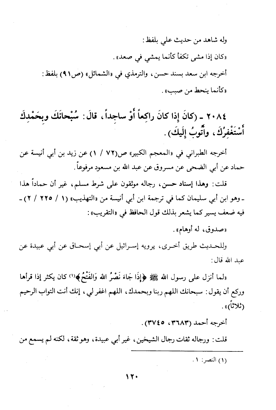 2084 - " كان إذا كان راكعا أو ساجدا، قال: سبحانك وبحمدك أستغفرك وأتوب إليك ".