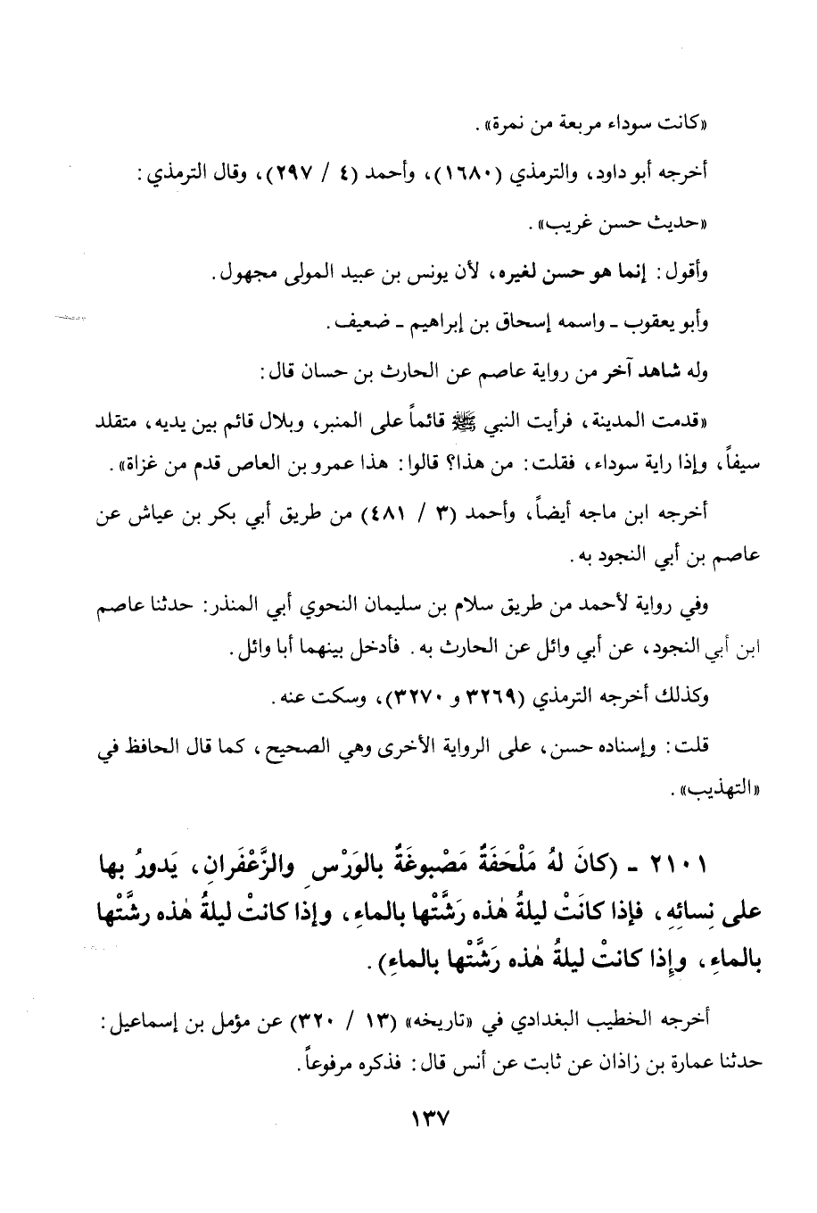 2101 - " كان له ملحفة مصبوغة بالورس والزعفران يدور بها على نسائه، فإذا كانت ليلة