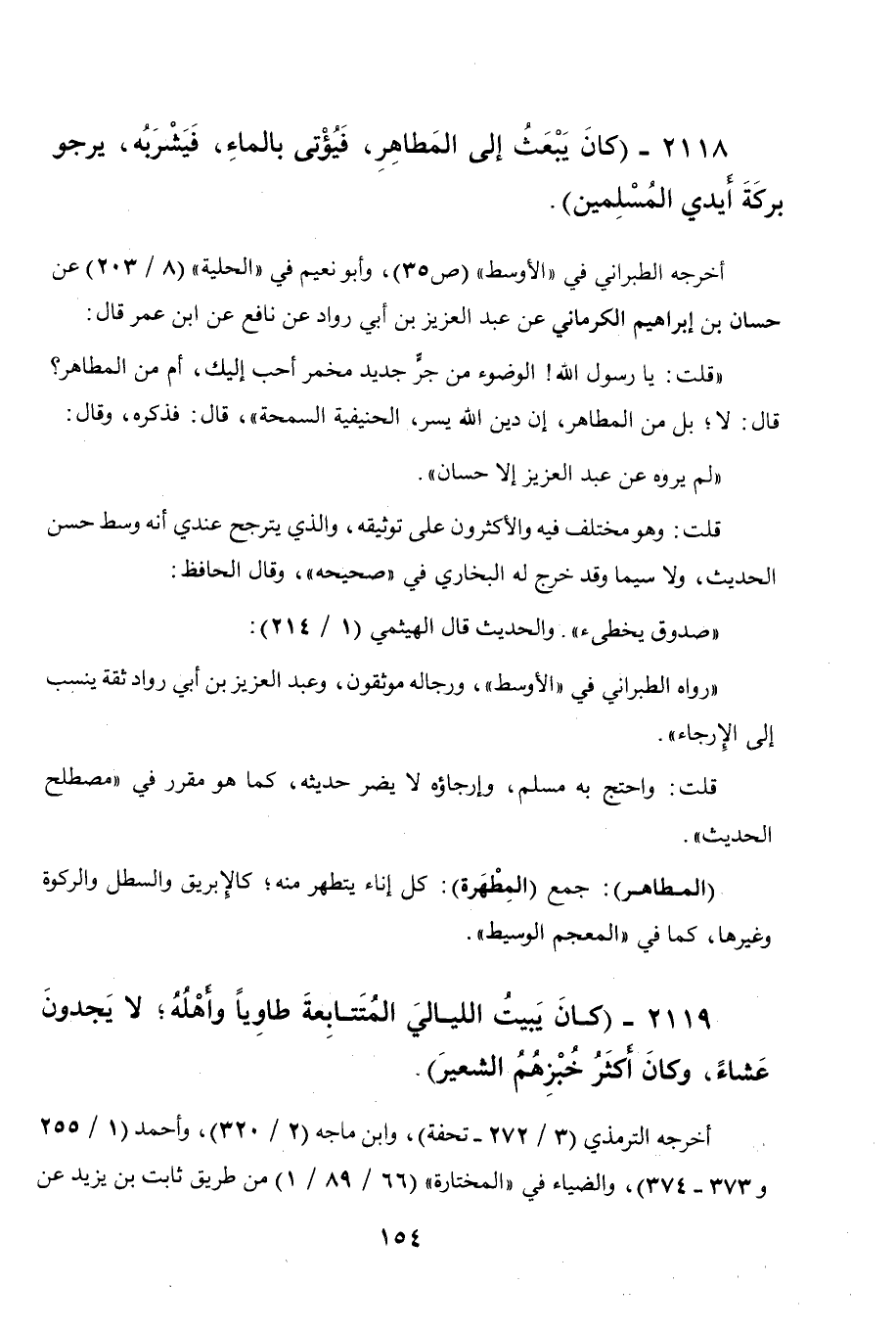 2118 - " كان يبعث إلى المطاهر، فيؤتى بالماء، فيشربه يرجو بركة أيدي المسلمين ".