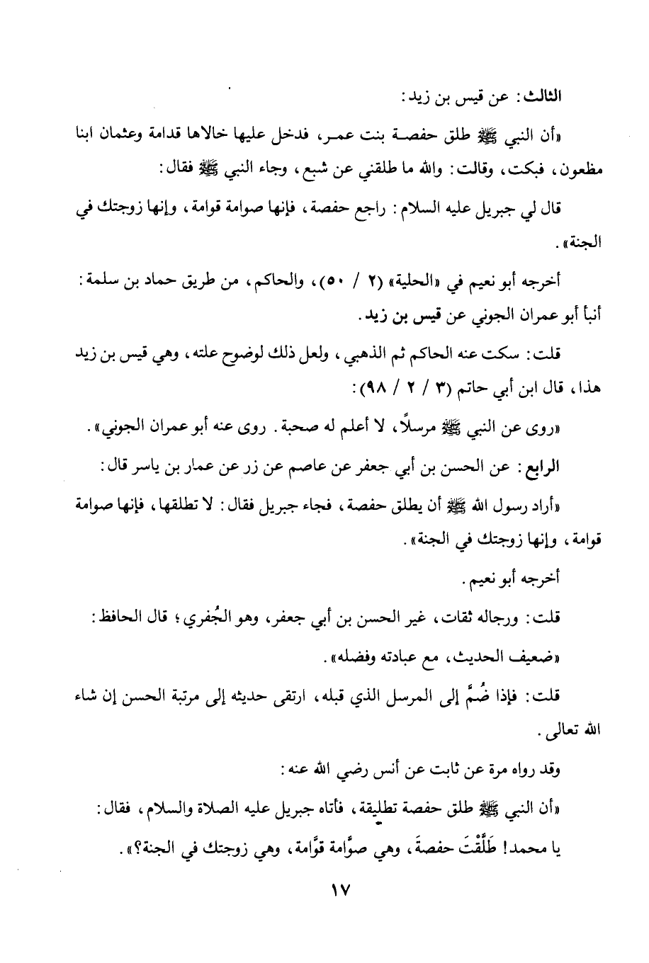 الثالث: عن قيس بن زيد: " أن النبي صلى الله عليه وسلم طلق حفصة بنت عمر،