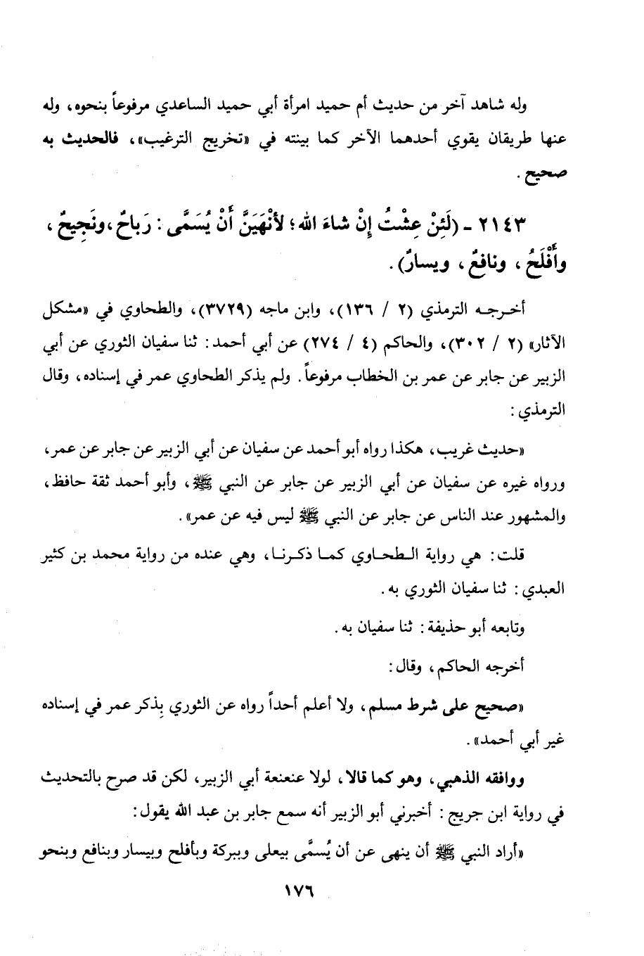 2143 - " لئن عشت إن شاء الله لأنهين أن يسمى: رباح ونجيح وأفلح ونافع ويسار ".