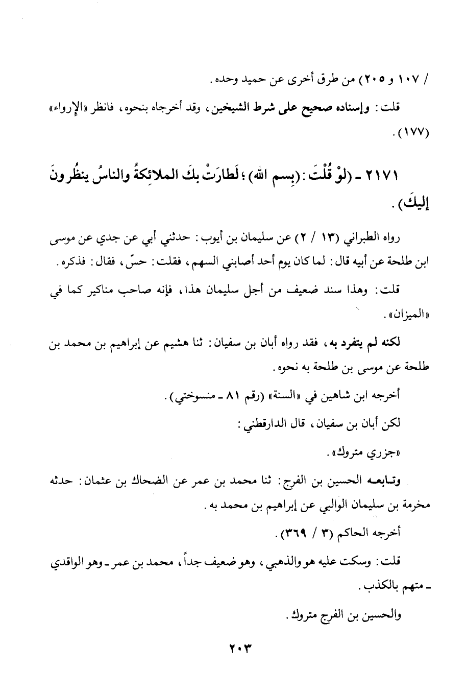 2171 - " لو قلت: (بسم الله) ، لطارت بك الملائكة والناس ينظرون إليك ".
