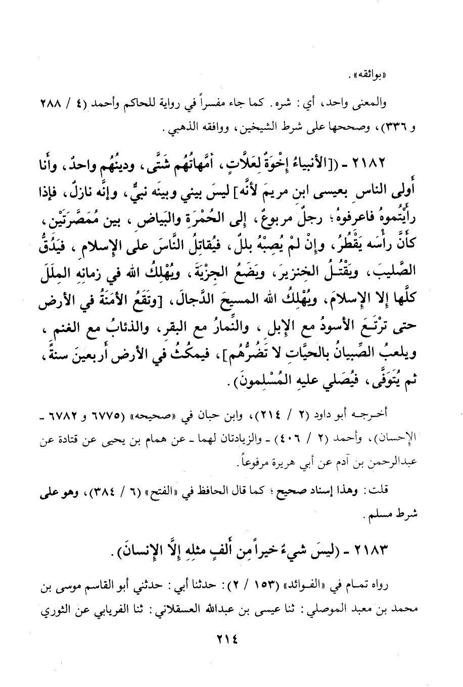 2182 - " (الأنبياء إخوة لعلات، أمهاتهم شتى ودينهم واحد وأنا أولى الناس بعيسى بن