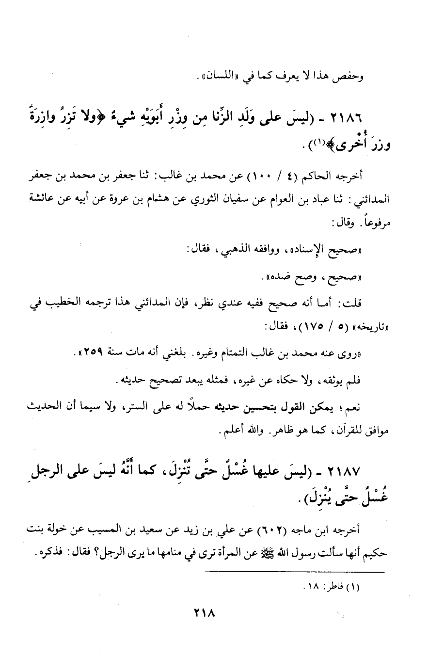 2186 - " ليس على ولد الزنا من وزر أبويه شيء * (ولا تزر وازرة وزر أخرى) * (¬1) ".