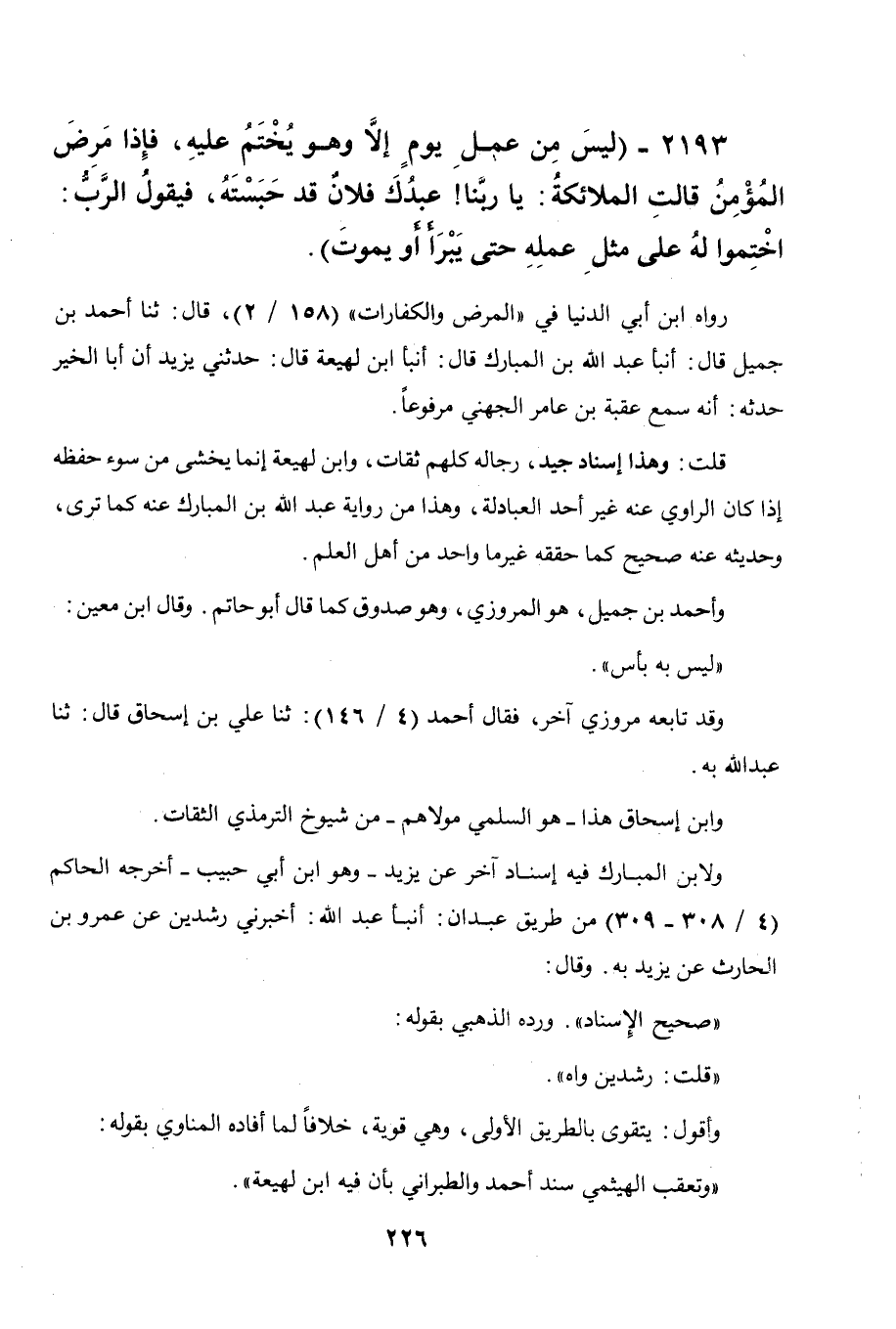 2193 - " ليس من عمل يوم إلا وهو يختم عليه، فإذا مرض المؤمن قالت الملائكة: يا