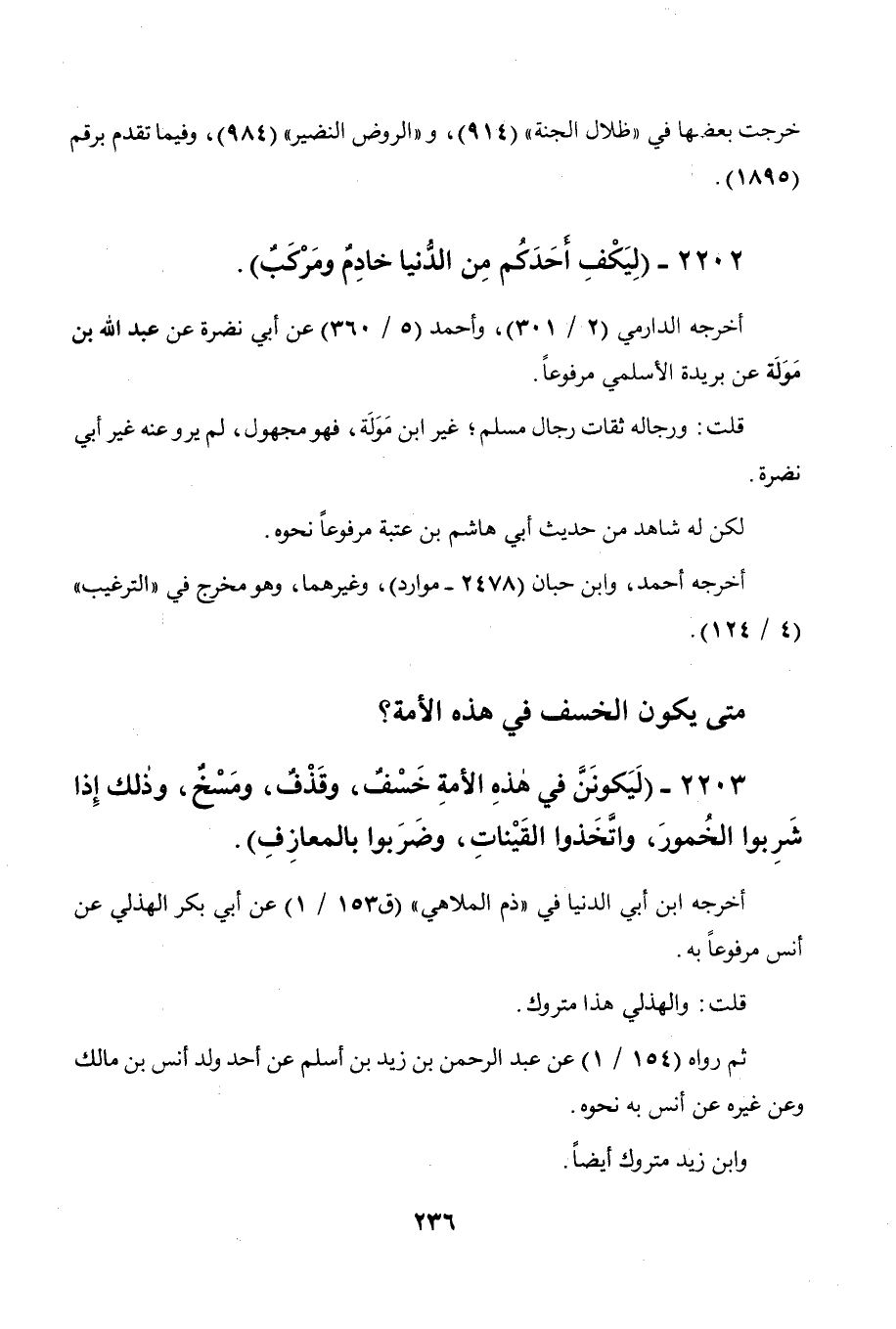 2203 - " يكونن في هذه الأمة خسف وقذف ومسخ، وذلك إذا شربوا الخمور واتخذوا