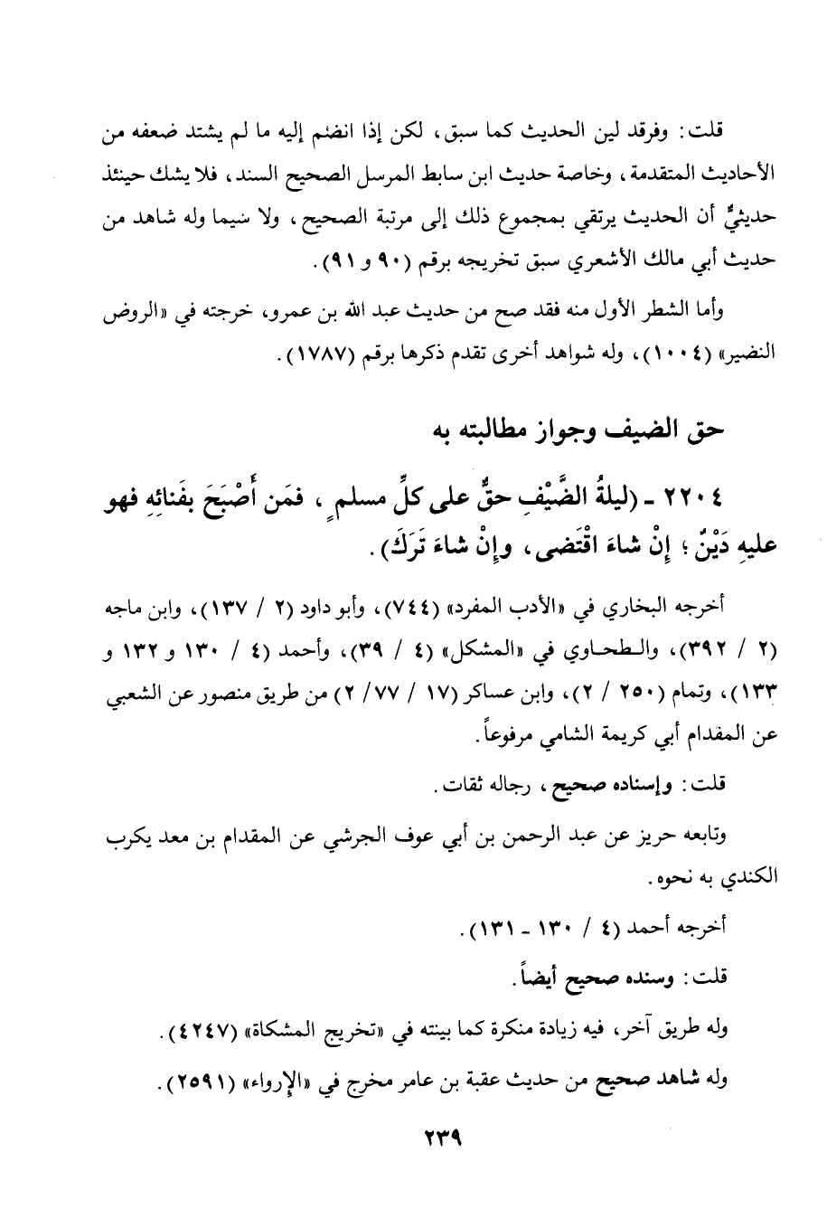 2204 - " ليلة الضيف حق على كل مسلم، فمن أصبح بفنائه فهو عليه دين إن شاء اقتضى وإن