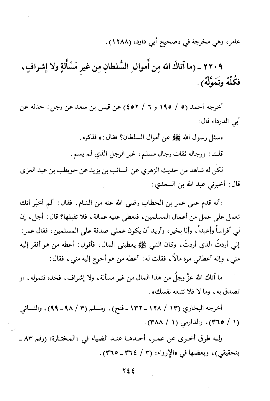 2209 - " ما آتاك الله من أموال السلطان من غير مسألة ولا إشراف، فكله وتموله ".