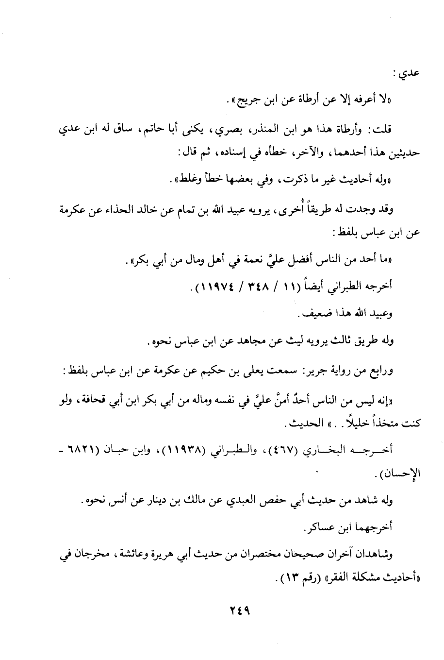 عن ابن عباس بلفظ: " ما أحد من الناس أفضل علي نعمة في أهل ومال من أبي بكر "