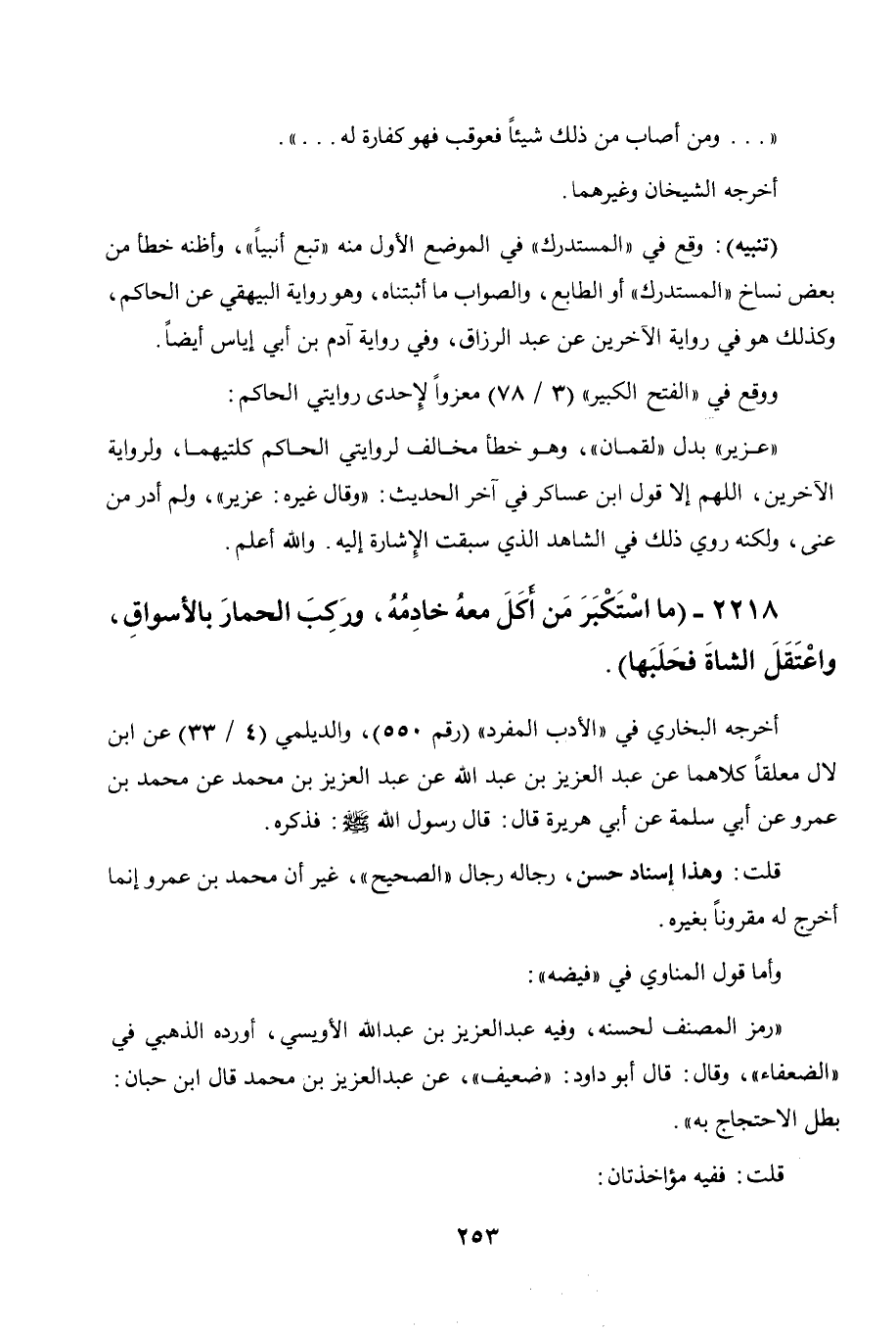 2218 - " ما استكبر من أكل معه خادمه وركب الحمار بالأسواق واعتقل الشاة فحلبها ".
