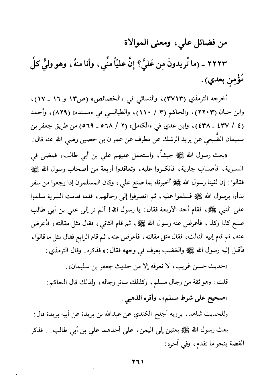 2223 - " ما تريدون من علي؟ إن عليا مني وأنا منه وهو ولي كل مؤمن بعدي ".