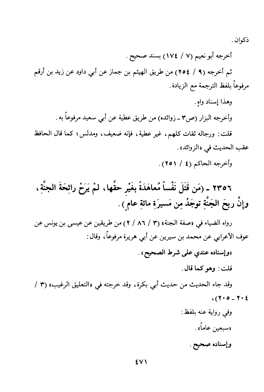 2356 - " من قتل نفسا معاهدة بغير حقها لم يرح رائحة الجنة وإن ريح الجنة توجد من