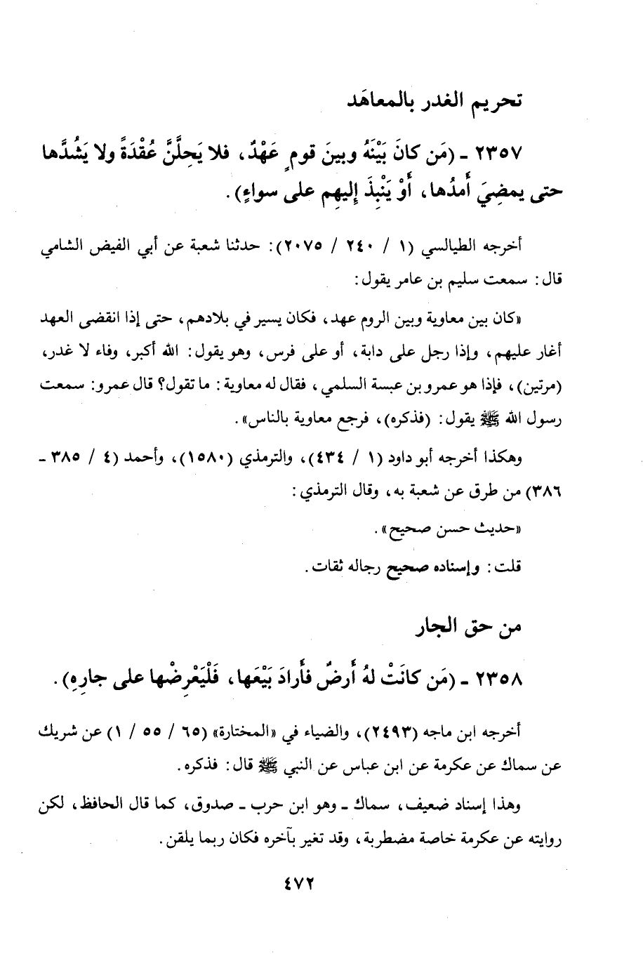 2357 - " من كان بينه وبين قوم عهد، فلا يحلن عقدة ولا يشدها حتى يمضي أمدها، أو