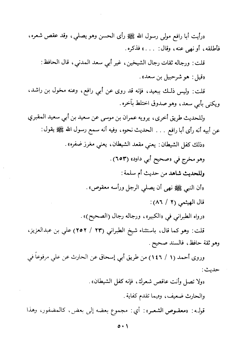 أم سلمة: " أن النبي صلى الله عليه وسلم نهى أن يصلي الرجل ورأسه معقوص ".