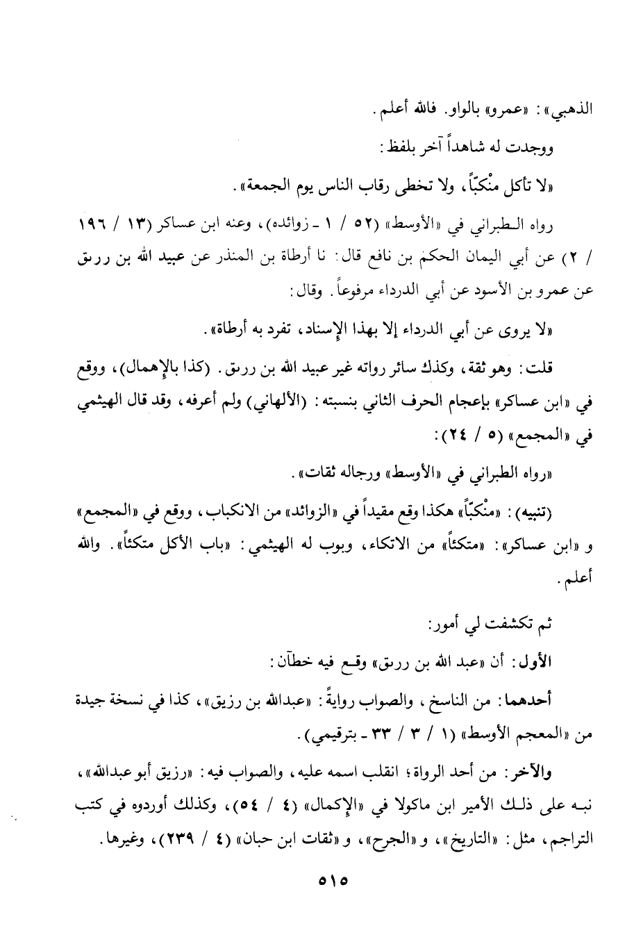 باب الأكل متكئا ". والله أعلم. ثم تكشفت لي أمور: الأول: أن " عبد الله
