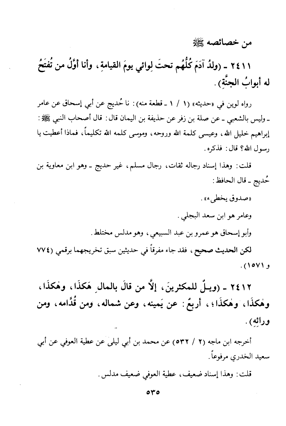 2411 - " ولد آدم كلهم تحت لوائي يوم القيامة، وأنا أول من تفتح له أبواب الجنة ".