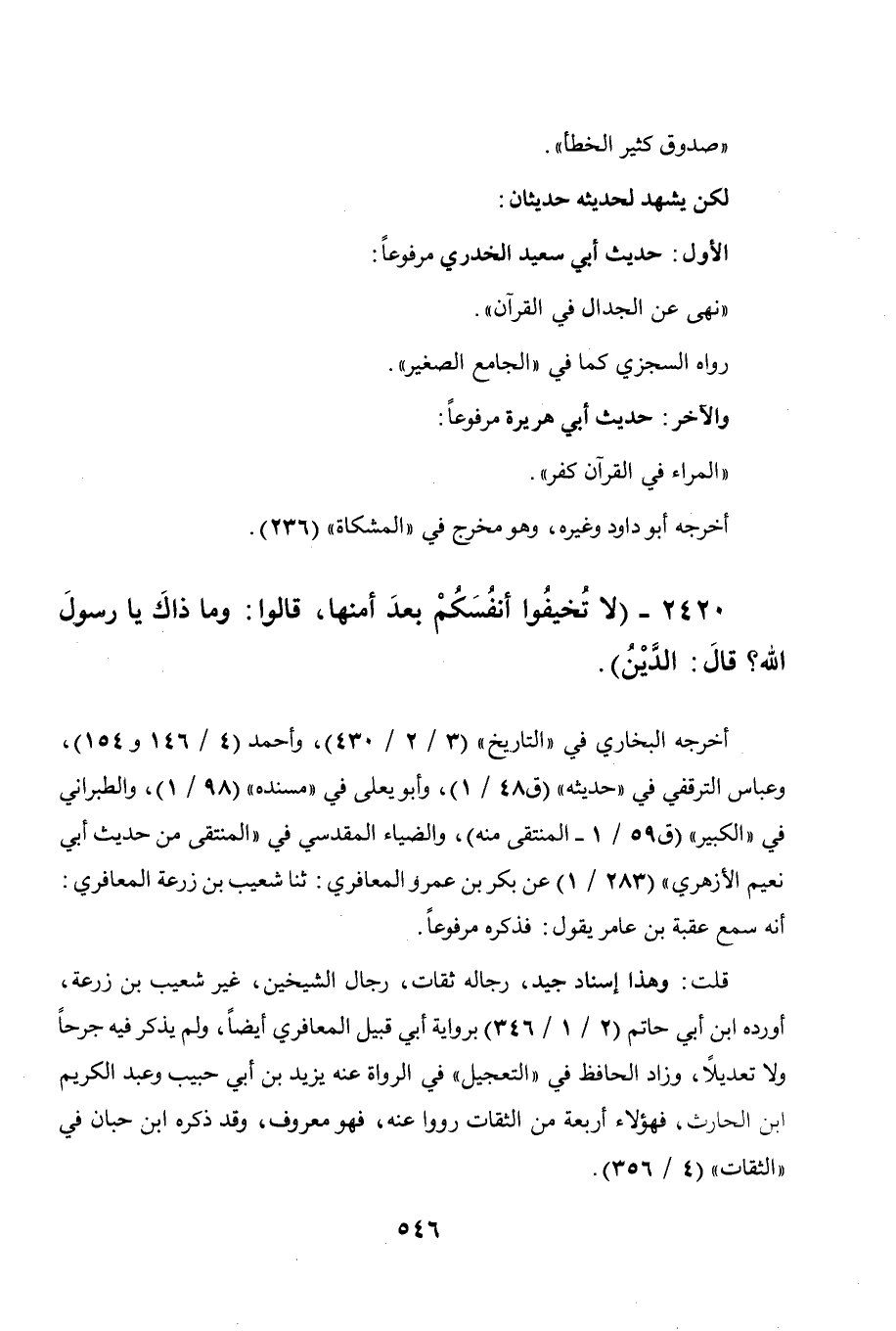 2420 - " لا تخيفوا أنفسكم بعد أمنها، قالوا: وما ذاك يا رسول الله؟ قال: الدين ".