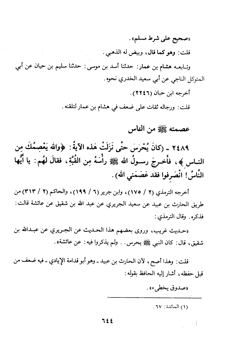 2489 - " كان يحرس حتى نزلت هذه الآية: * (والله يعصمك من الناس) * (¬1) ، فأخرج