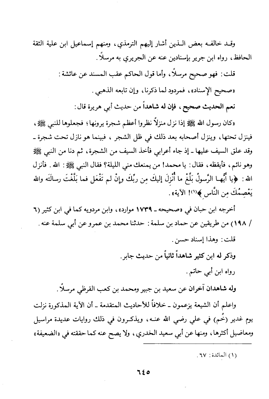 فما بلغت رسالته والله يعصمك من الناس) * (¬1) ! الآية ". أخرجه ابن حبان في (