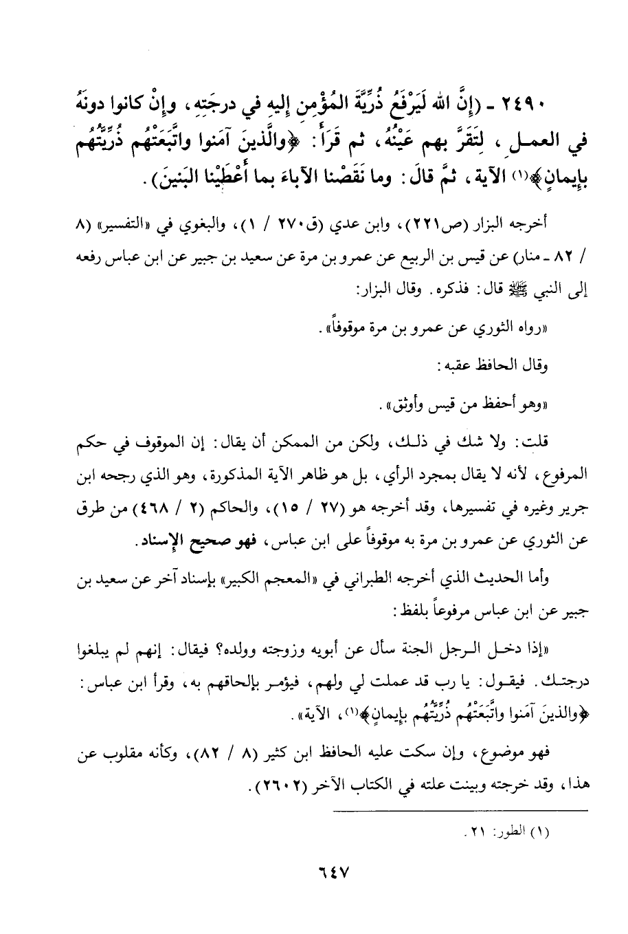 2490 - " إن الله ليرفع ذرية المؤمن إليه في درجته وإن كانوا دونه في العمل، لتقر