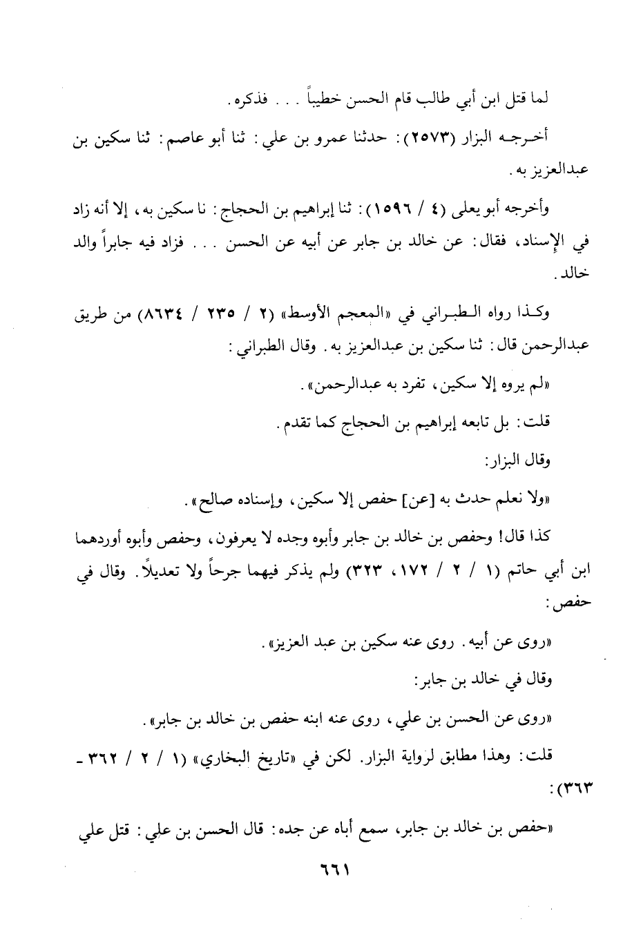 363) : " حفص بن خالد بن جابر، سمع أباه عن جده: قال الحسن بن علي: قتل علي