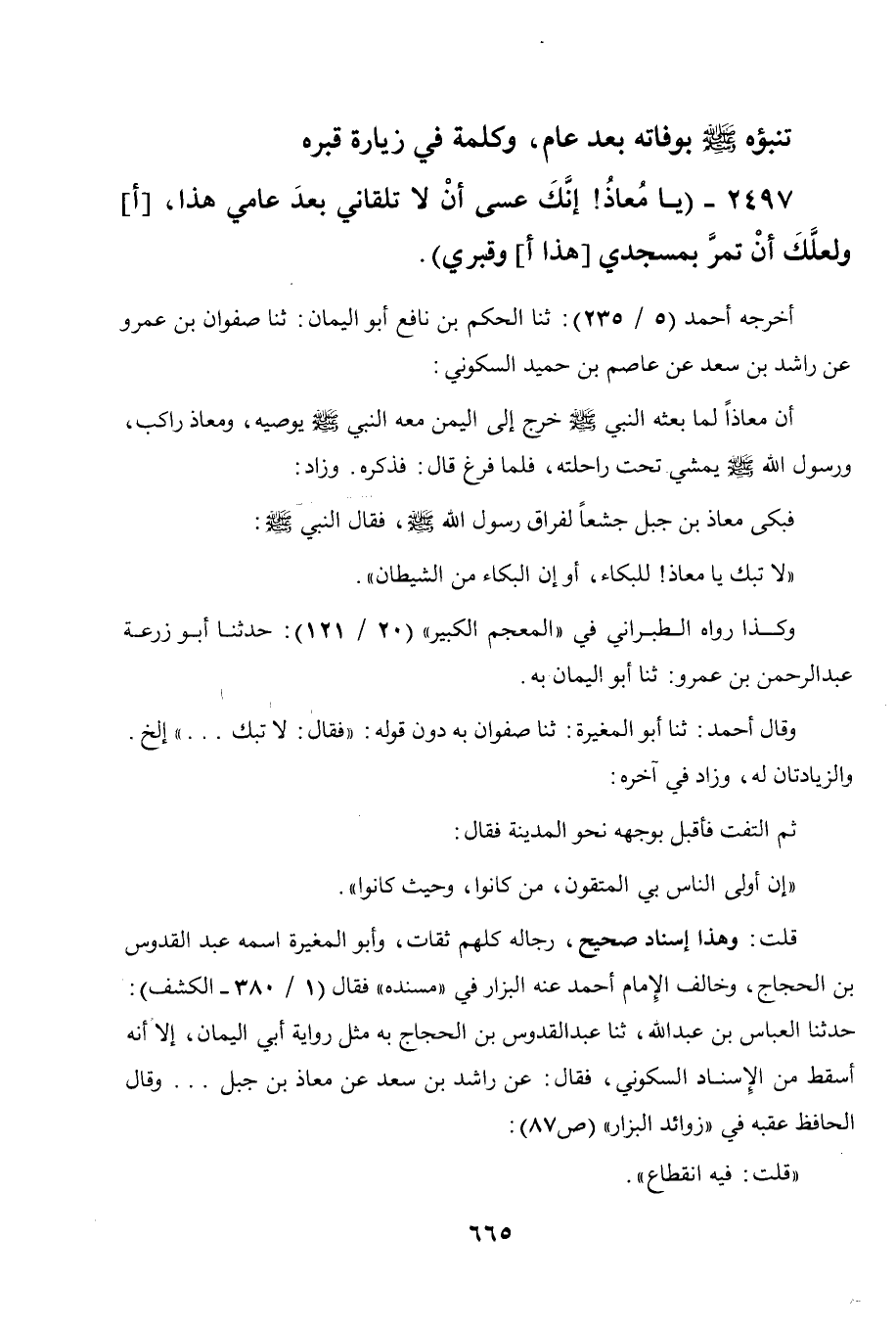 2497 - " يا معاذ! إنك عسى أن لا تلقاني بعد عامي هذا، [أ] ولعلك أن تمر بمسجدي
