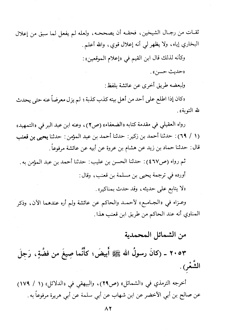 2053 - " كان رسول الله صلى الله عليه وسلم أبيض، كأنما صيغ من فضة، رجل الشعر ".