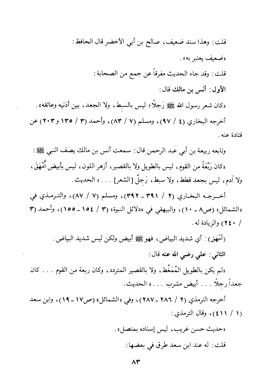 بالقصير أزهر اللون ليس بأبيض أمهق ولا آدم ليس بجعد قطط ولا سبط رجل (الشعر
