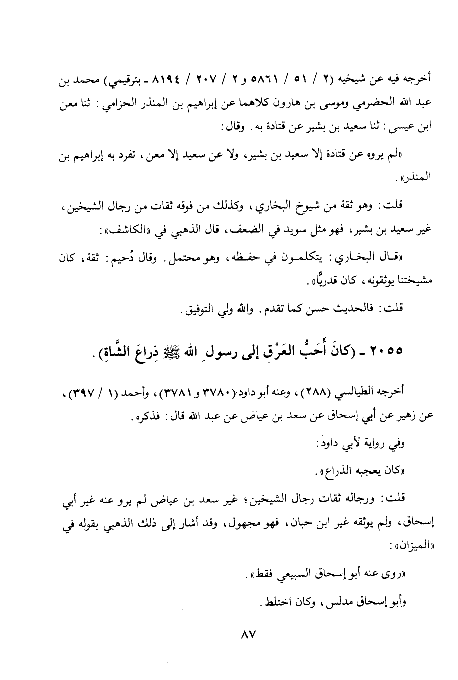 2055 - " كان أحب العرق إلى رسول الله صلى الله عليه وسلم ذراع الشاة ".